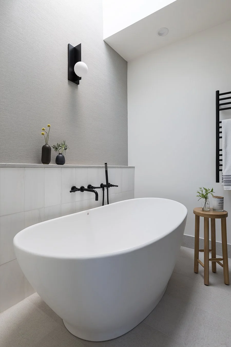 The primary closet gets a wallpapered ceiling in a pattern that surprises without overwhelming. The primary bedroom wraps in a delicate pattern wallpaper — quiet and considered, a deliberate counterpoint to the bolder spaces beyond. The primary bath is the still point of the home. Marble and limestone tile in a restrained palette create a spa-like retreat that earns its calm precisely because the rest of the house is so alive.