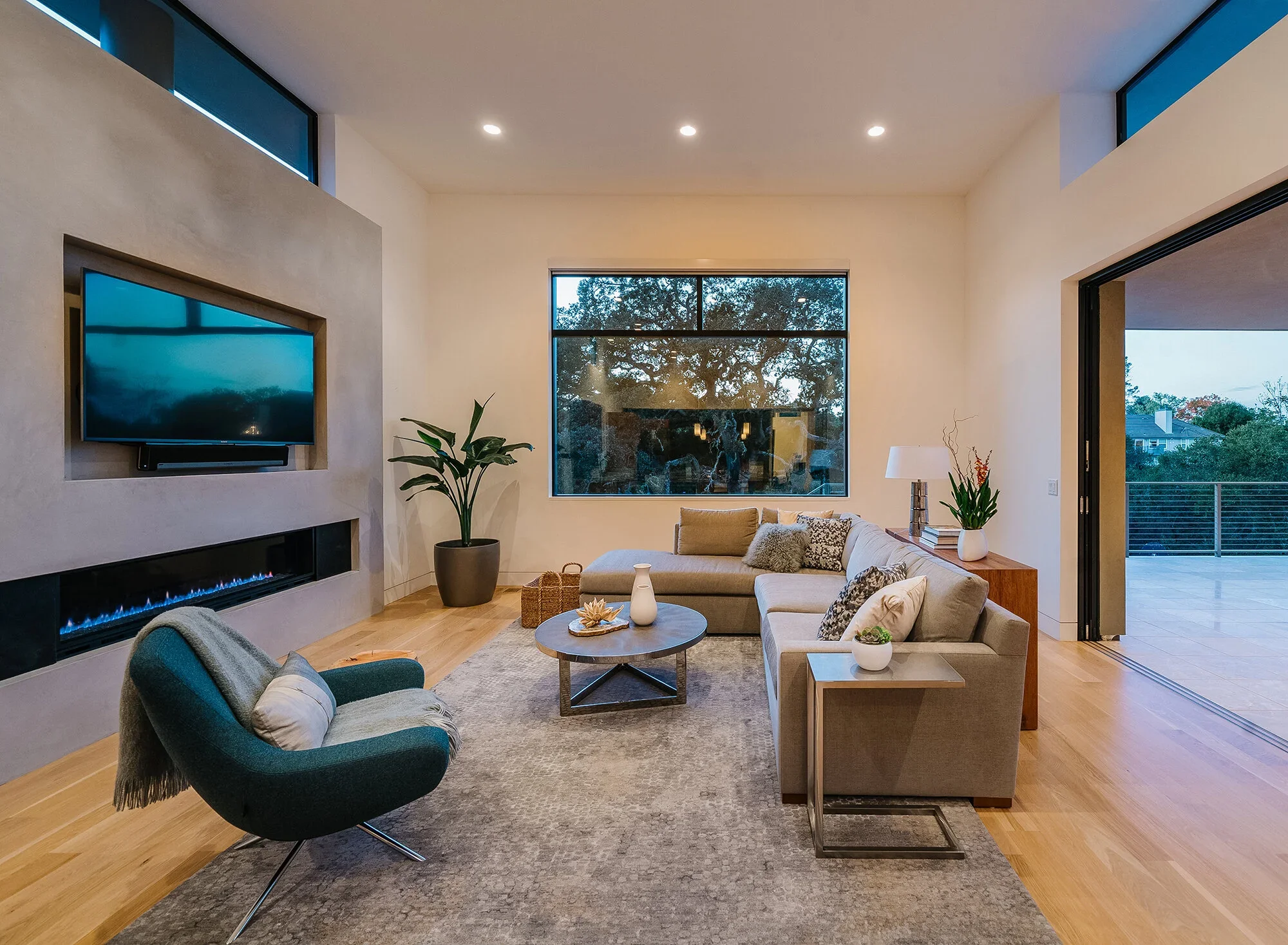 TCLee Design’s contribution was to match that architectural restraint with a finish program built for longevity rather than moment. Vein-cut travertine and natural stone in the primary bath bring warmth and quiet depth to the home’s most private spaces. A concrete fireplace anchors the living area with understated permanence. Neutral tones and glass tile run throughout — materials chosen not for their immediate impact but for how they’ll feel ten years from now, when the house has fully become itself.