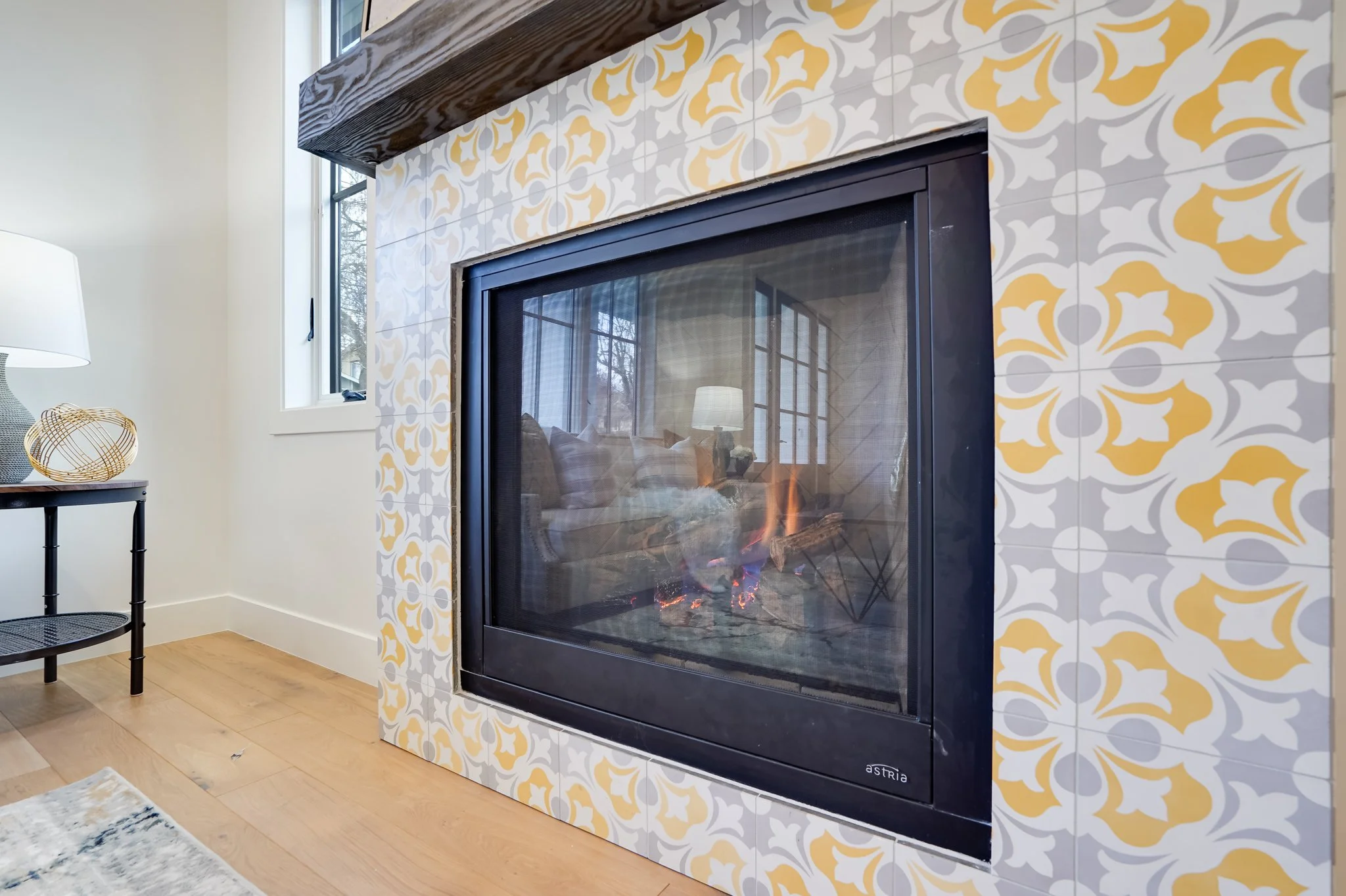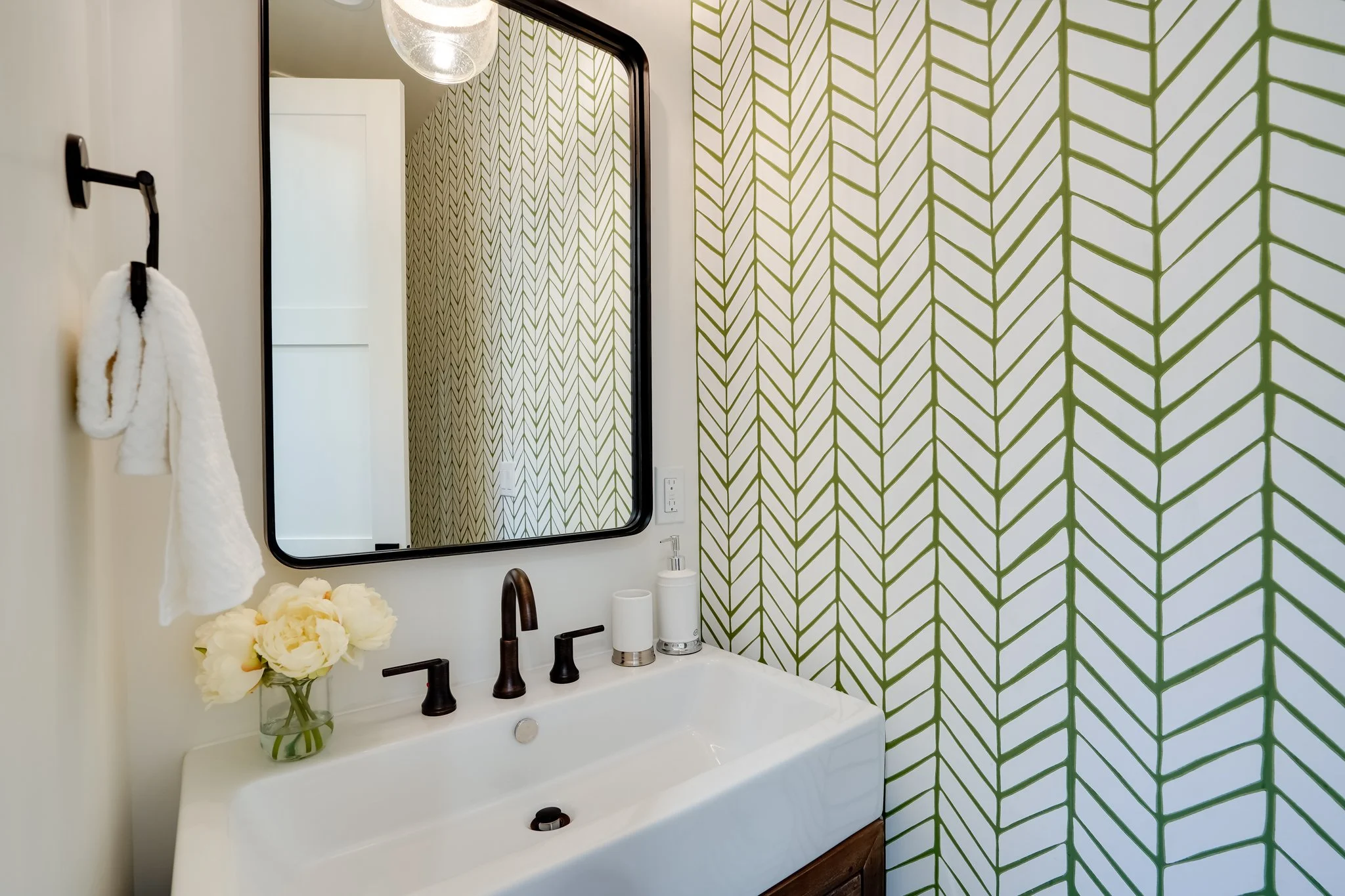 The approach was restraint with personality. Shiplap paneling brings texture and warmth without committing to a moment in time. A cement tile fireplace surround introduces color and pattern at the room’s natural focal point — bold enough to be memorable, considered enough to age well. A fun wallpaper in the powder room gives that small space a strong identity, the kind of detail that prospective buyers remember long after the showing is over.
